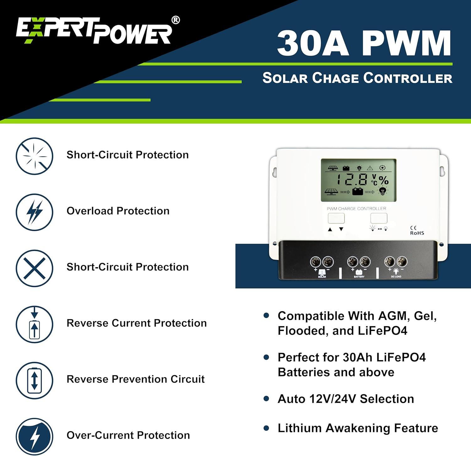 ExpertPower 20A PWM Solar Charge Controller Kit for LiFePO4, AGM, Gel, Flooded Battery | 12V / 24V Auto-Select Intelligent Regulator | Max PV Input 55V | USB Charge | Backlight LCD Display(30A)